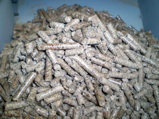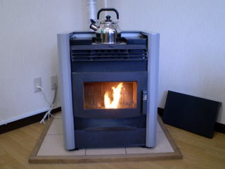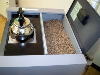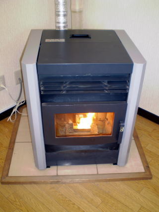 ・灯油、薪の替わりに木質ペレット(固形燃料)を使用します。自動供給ですので、燃料タンクいっぱいに木質ペレットを入れておけば、約15時間の連続燃焼が可能です。 |